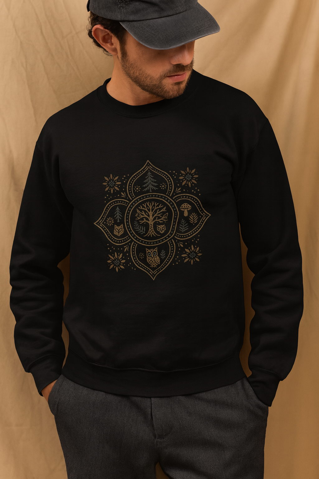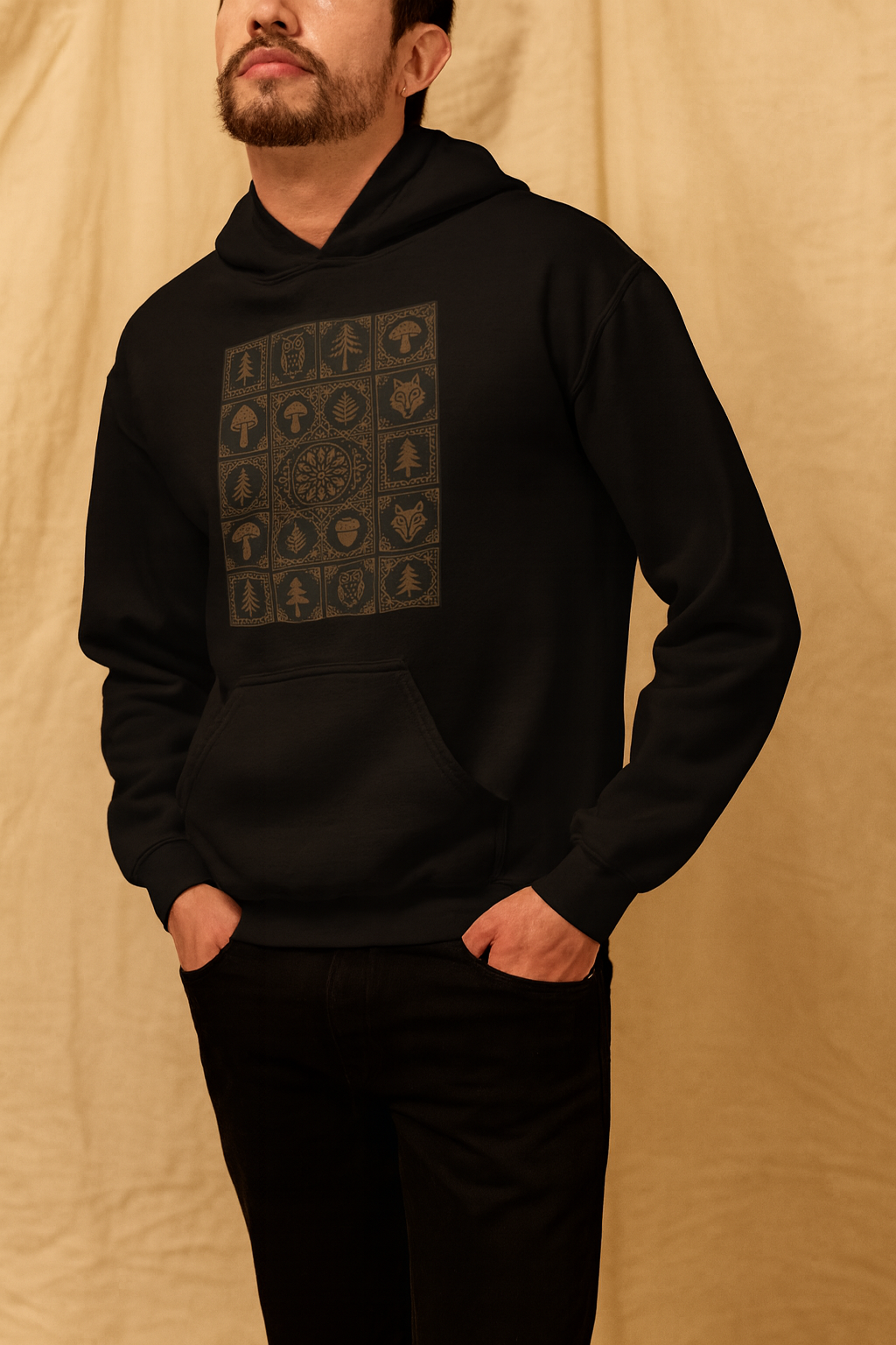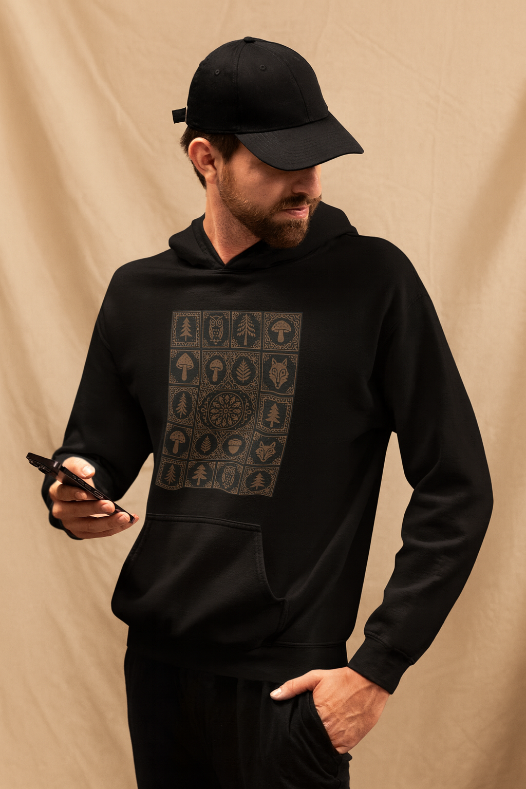 The Forest Symbols Organic Cotton Hoodie in Black combines premium quality with sustainable design. Crafted from 100% organic cotton, this unisex hoodie offers a soft, breathable feel and long-lasting comfort, making it a versatile essential for everyday wear. The front features a grid of forest-inspired motifs — owls, foxes, trees, and acorns — symbolizing a deep connection to nature with a modern, minimalist aesthetic.